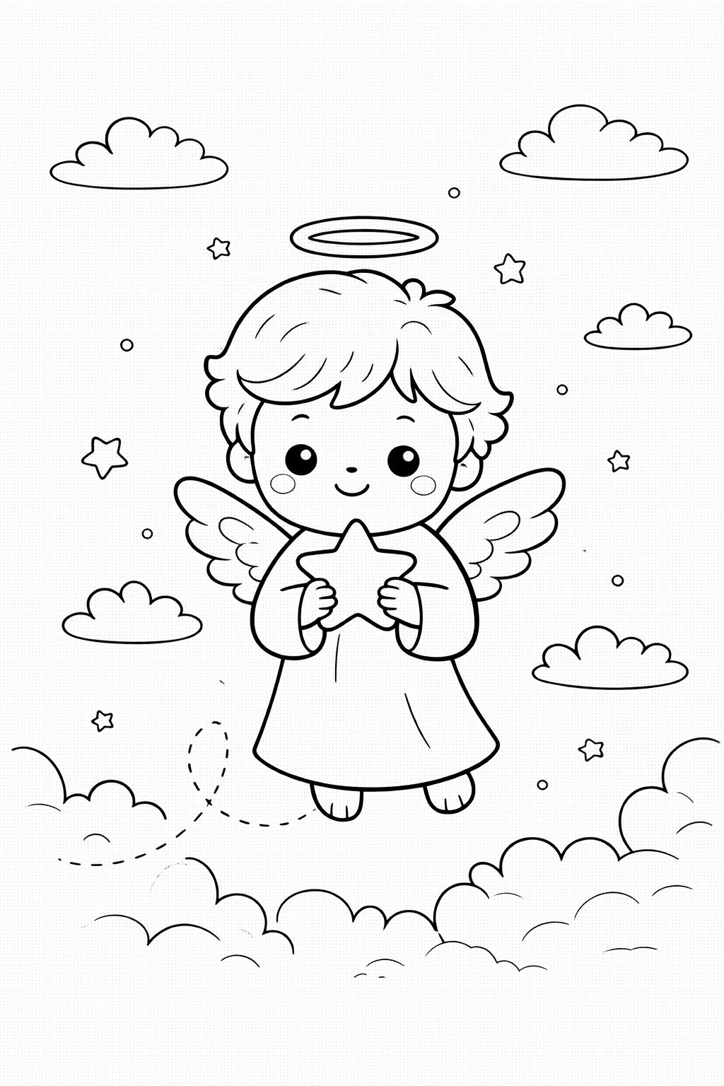 Styl Ilustracji: To uroczy, uśmiechnięty aniołek w przyjaznym, kreskówkowym stylu. Grube, wyraźne kontury ułatwiają najmłodszym trzymanie się linii, a duże, radosne oczy, małe skrzydełka i aureola tworzą ciepłą, pogodną kompozycję. Całość otaczają proste elementy, takie jak gwiazdki i chmurki, które zachęcają do chwycenia za kredki.