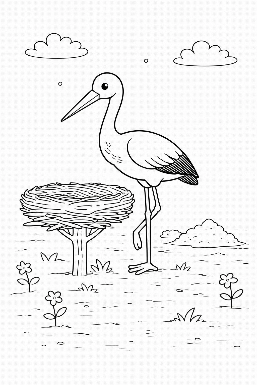 Styl ilustracji: Postawiliśmy na przyjazny, kreskówkowy styl. Bocian narysowany jest grubą, wyraźną kreską, co ułatwia precyzyjne kolorowanie wewnątrz konturów. Proste kształty i brak skomplikowanych detali sprawiają, że obrazek jest czytelny i zachęcający, a delikatne elementy tła, jak gniazdo czy łąka, pobudzają wyobraźnię.