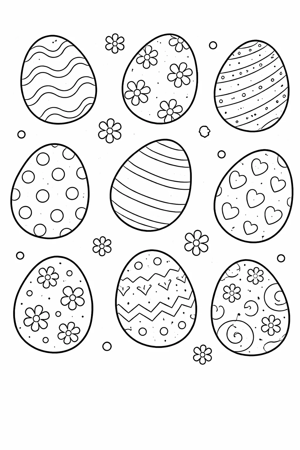 Nasza ilustracja łączy urok tradycyjnych, ludowych wzorów z nowoczesną, czystą kreską. Znajdziesz tu pisanki inspirowane naturą – wijące się gałązki, symetryczne kwiaty i delikatne listki. Grube, wyraźne kontury ułatwiają pracę najmłodszym, a drobniejsze ornamenty wewnątrz pisanek stanowią satysfakcjonujące wyzwanie dla bardziej precyzyjnych twórców.