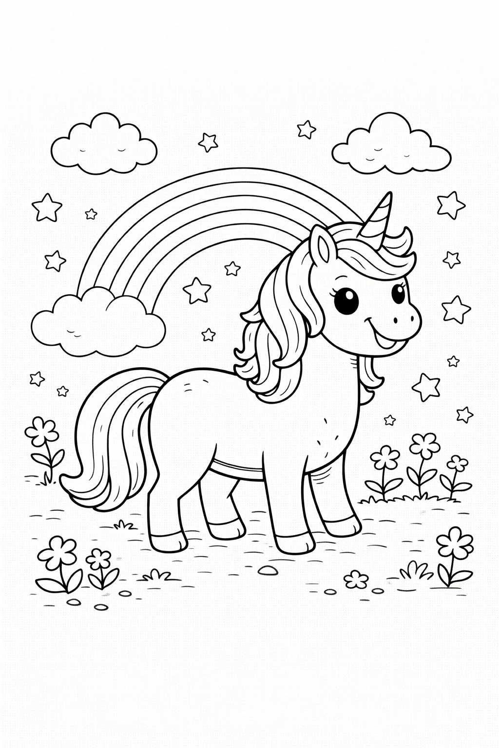 Magiczna ilustracja: W centrum grafiki znajduje się majestatyczny jednorożec z długą, falującą grzywą i spiralnym rogiem. Tło wypełniają magiczne elementy: rozgwieżdżone niebo, puszyste chmury, tęcza i kwitnące pnącza. Wyraźne kontury ułatwiają pracę, a liczne detale, jak wzory na grzywie czy płatki kwiatów, zachęcają do eksperymentowania z kolorami.