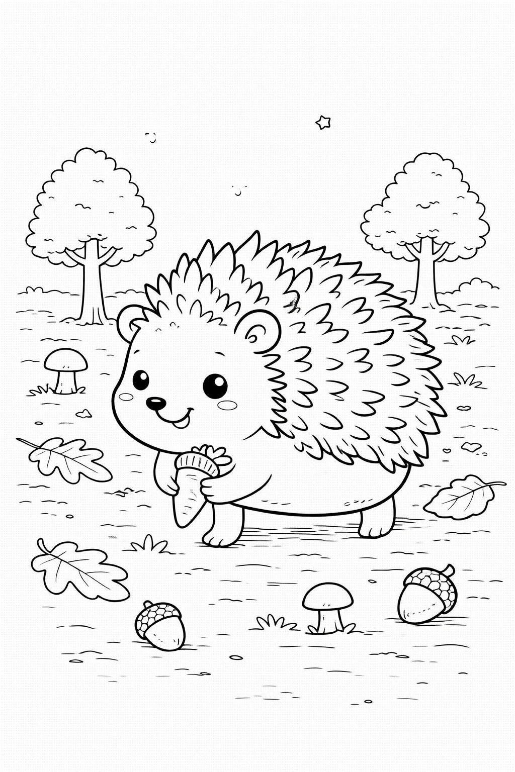 Poziom Trudności: Niski do średniego. Kolorowanka jest idealna dla początkujących. Duże pola, jak brzuszek jeża czy kapelusz grzybka, są wprost stworzone dla rączek, które dopiero oswajają kredki. Jednocześnie drobniejsze detale, jak listki czy kolce, stanowią przyjemne wyzwanie dla nieco starszych dzieci, pozwalając im ćwiczyć dokładność.