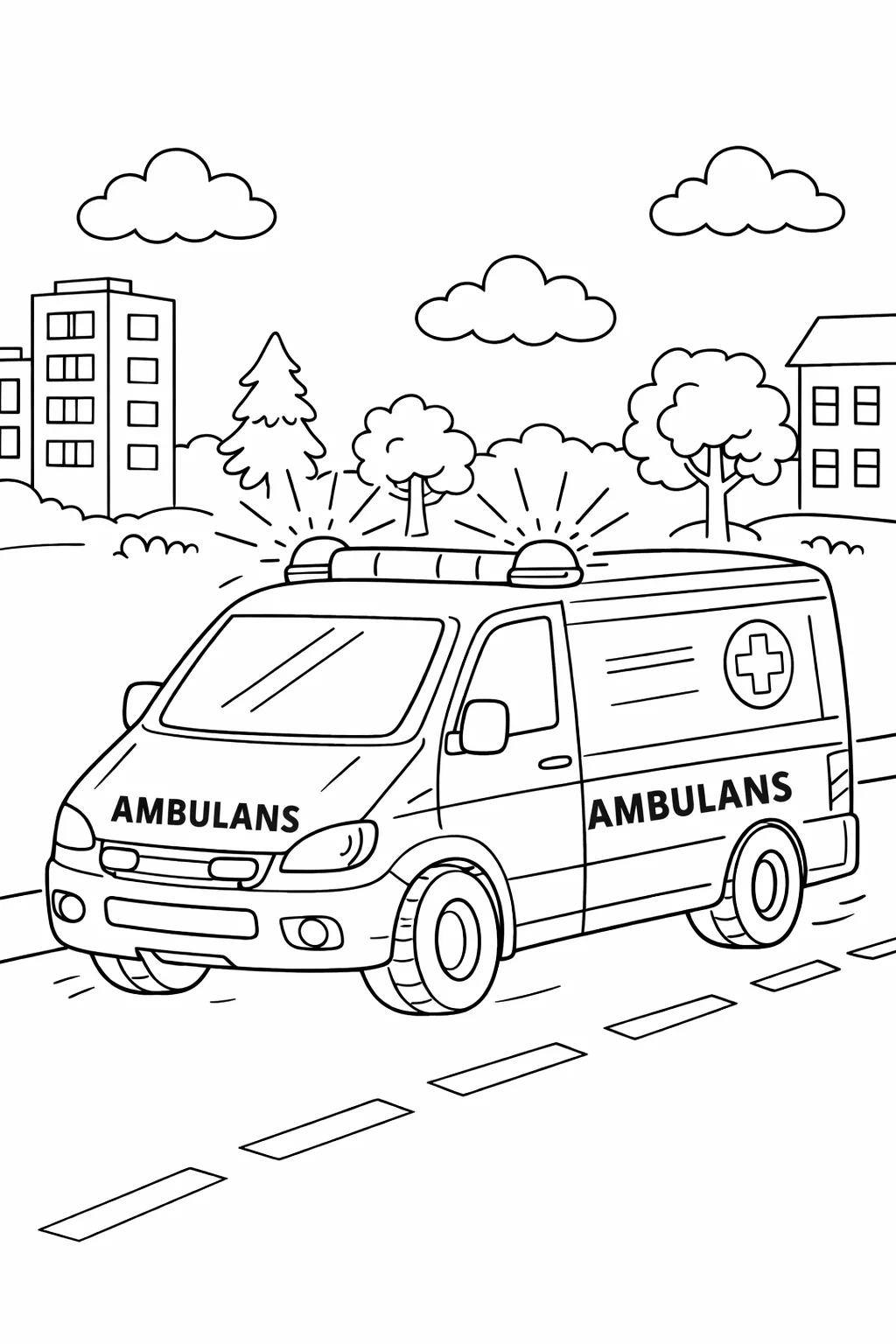Przyjazny design: Uśmiechnięta karetka z dużymi kołami, charakterystycznym czerwonym krzyżem i migającym „kogutem” na dachu jest przedstawiona w dynamicznej pozie. Proste tło z chmurkami i drogą pozwala skupić całą uwagę na głównym pojeździe.
