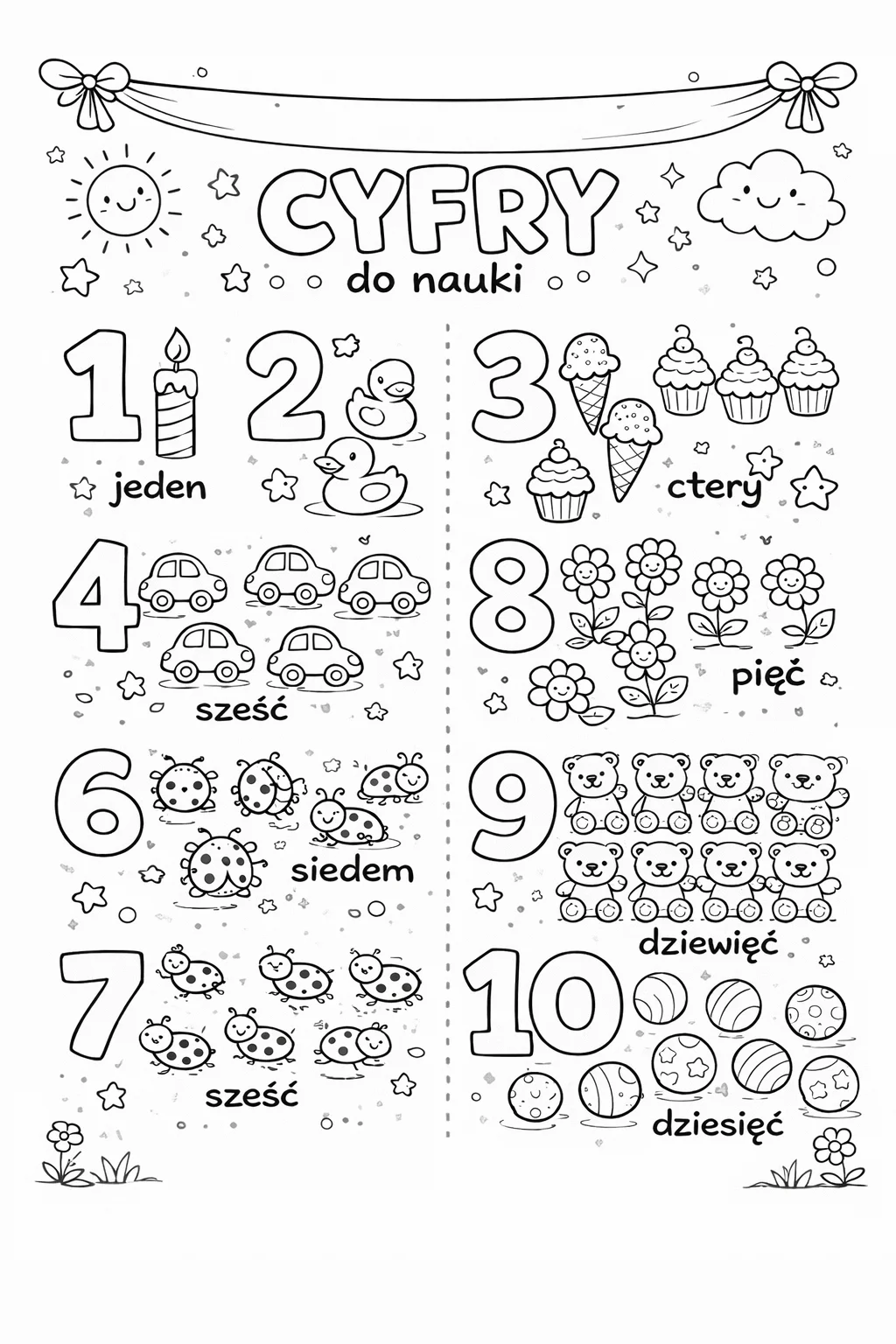 Kolorowanki z cyframi 1–10 do druku – nauka liczenia dla dzieci przez zabawę