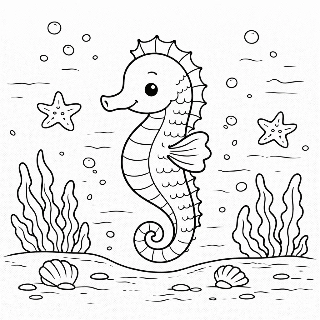 Styl ilustracji: Postawiliśmy na uroczy, bajkowy styl. Konik morski ma przyjazny wygląd i jest otoczony fantazyjnymi elementami podwodnego świata – wirującymi bąbelkami, delikatnymi wodorostami i ukrytymi muszelkami. Wyraźne kontury ułatwiają kolorowanie, a detale, takie jak wzory na ciele konika czy zdobienia płetw, zachęcają do eksperymentowania z kolorami.
