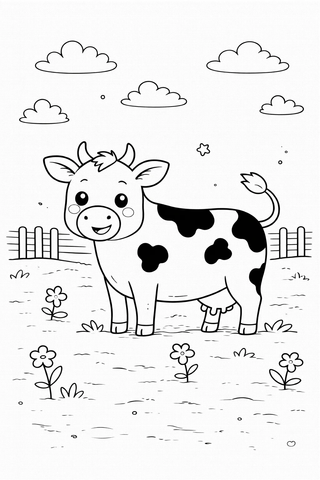 Przyjazny, kreskówkowy styl: Uśmiechnięta krowa z dużymi, sympatycznymi oczami od razu zachęca do chwycenia za kredki. Proste tło z elementami łąki, takimi jak kwiatek czy chmurka, pobudza wyobraźnię, nie przytłaczając nadmiarem detali.