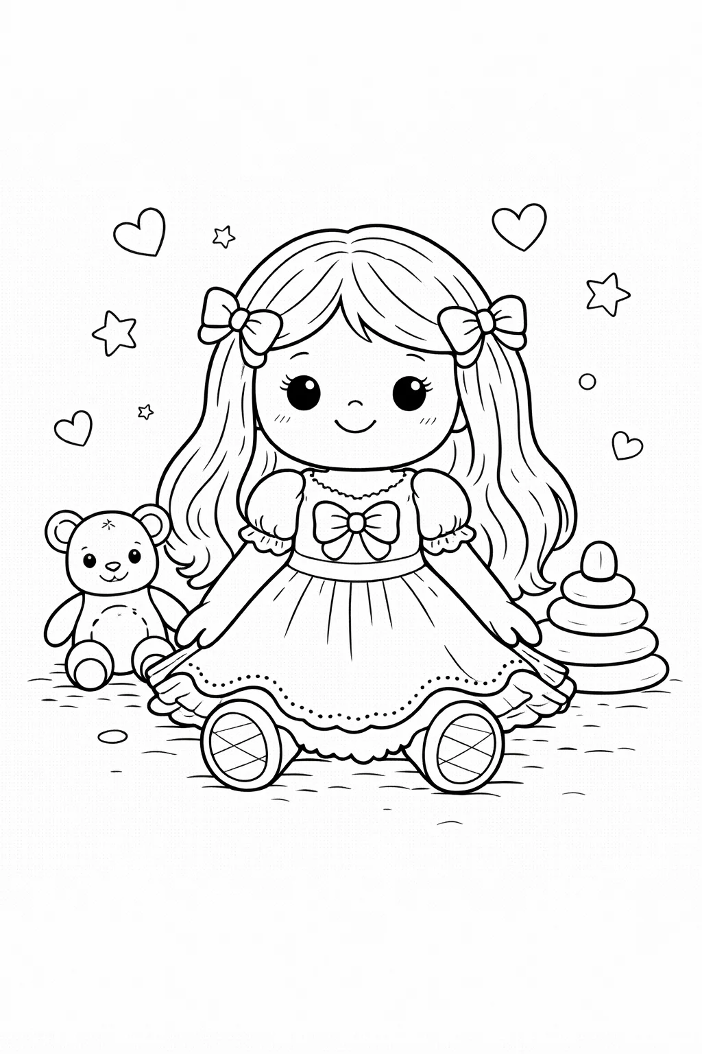 Nasza ilustracja to kwintesencja przyjaznego, bajkowego stylu. Lalka ma sympatyczną, uśmiechniętą buzię, piękną, bufiastą sukienkę i urocze detale, jak choćby kokardki we włosach. Grube, wyraźne kontury to nie przypadek – to zaproszenie do zabawy dla najmłodszych, które ułatwia precyzyjne kolorowanie i daje mnóstwo satysfakcji.