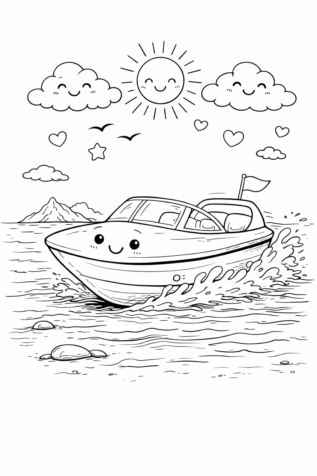 Styl ilustracji: Przyjazny, kreskówkowy styl, który przyciąga wzrok. Kontury są wyraźne i grube, co ułatwia precyzyjne kolorowanie nawet najmłodszym. Scena przedstawia motorówkę prującą wodę i tworzącą za sobą widowiskowy pióropusz piany. W tle znajdziesz proste elementy krajobrazu – słońce i chmury – które dopełniają radosny charakter obrazka.
