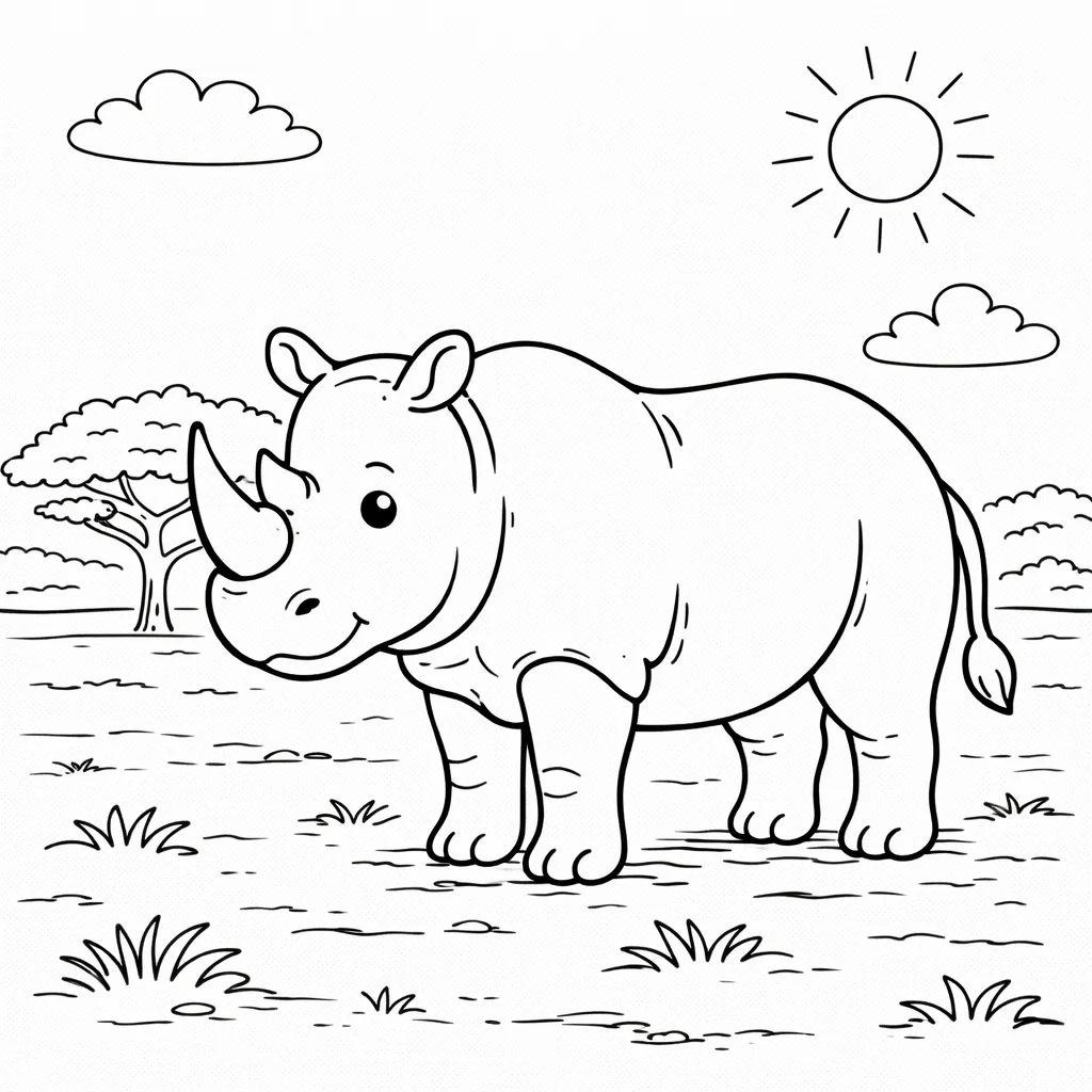 Ilustracja utrzymana jest w przyjaznym, kreskówkowym stylu, który zdobędzie serca dzieci. Nosorożec ma sympatyczny wygląd i duże, wyraziste oczy, budząc pozytywne emocje. Grube, wyraźne kontury ułatwiają precyzyjne kolorowanie, co jest idealnym rozwiązaniem dla najmłodszych. Tło zawiera proste elementy natury, takie jak trawy i słońce, które dopełniają scenę, nie przytłaczając głównego bohatera.Poziom Trudności