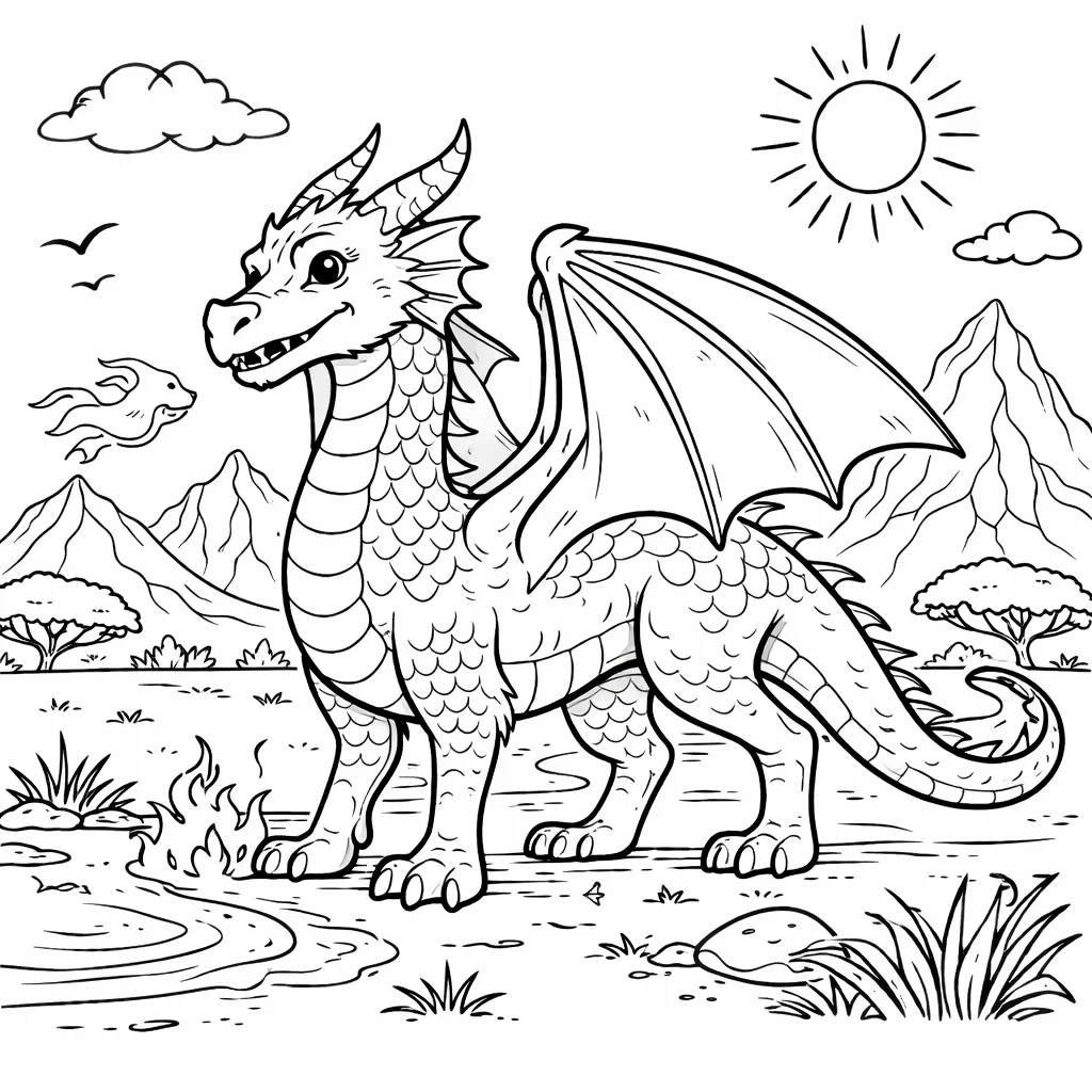 Ilustracja utrzymana jest w przyjaznym, baśniowym stylu. Smok, choć potężny, ma sympatyczny wygląd i duże, wyraziste oczy, co czyni go doskonałym towarzyszem przygód. Rysunek charakteryzuje się wyraźnymi, grubymi konturami, które ułatwiają precyzyjne kolorowanie i zapobiegają wychodzeniu poza linie. Znajdziesz tu zarówno duże powierzchnie, jak skrzydła czy brzuch, idealne do szybkiego wypełnienia kolorem, jak i mniejsze detale – łuski, pazury czy elementy tła – które zachęcają do eksperymentowania z odcieniami.