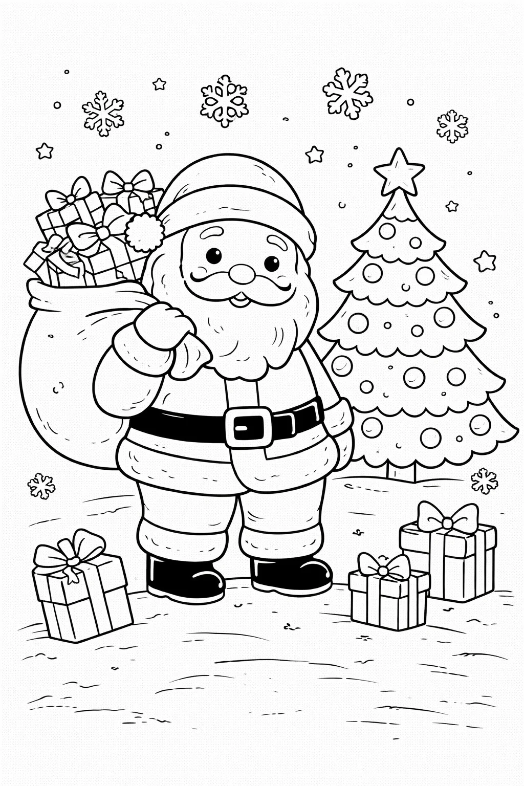 Styl ilustracji: Przyjazna, kreskówkowa postać Świętego Mikołaja jest wesoła i pełna ciepła, z charakterystyczną długą brodą i workiem pękającym w szwach od prezentów. Wyraźne, grube kontury ułatwiają precyzyjne kolorowanie, dzięki czemu nawet małe rączki poradzą sobie z zadaniem bez frustracji. Tło wypełniają urocze detale – gwiazdki, płatki śniegu i gałązki choinki.