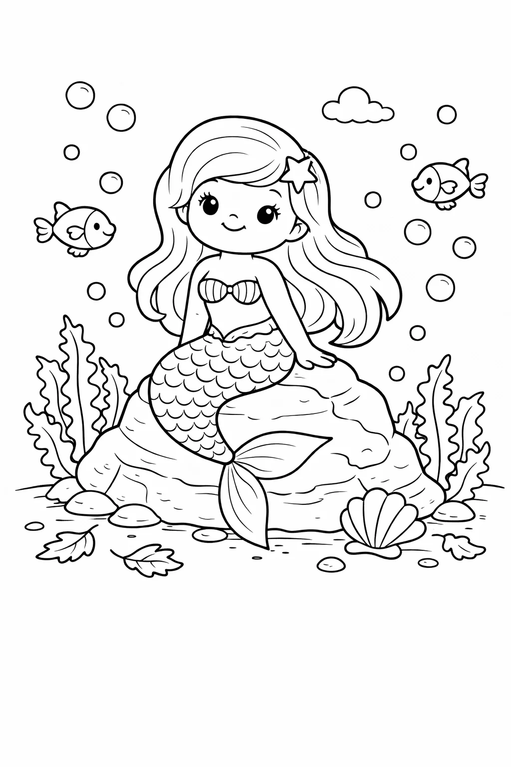 Ilustracja utrzymana jest w radosnym, bajkowym stylu, który natychmiast przyciąga wzrok. Uśmiechnięta syrenka z długimi, falującymi włosami i pięknie zdobionym ogonem jest centralną postacią sceny. Otaczają ją przyjazne elementy podwodnego świata – ciekawskie rybki, bąbelki powietrza, rozgwiazdy i delikatne wodorosty. Wyraźne i grube kontury ułatwiają precyzyjne kolorowanie, dzięki czemu gotowe dzieło wygląda niezwykle efektownie.